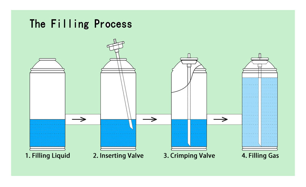It consist of liquid filling part, cap/valve sealing part, gas/propellant inflating part, also have separate model or 3-in-1 model for your different requirements.